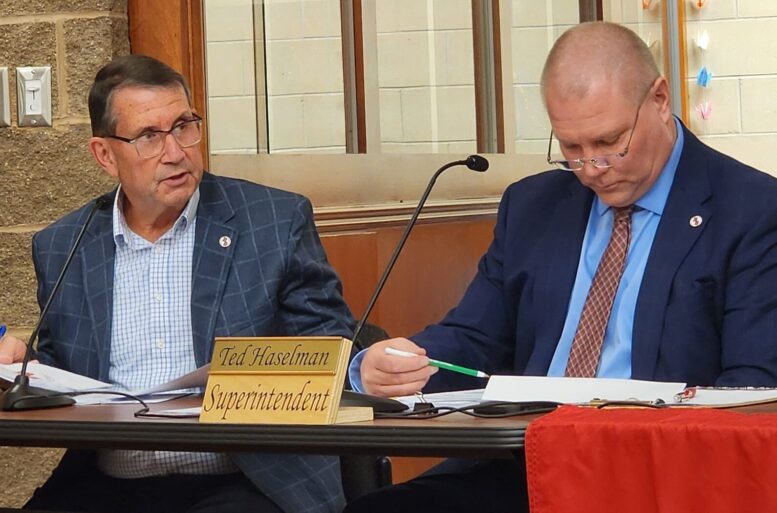 BG Schools Treasurer Matt Feasel reports on financial forecast as Superintendent Ted Haselman listens.