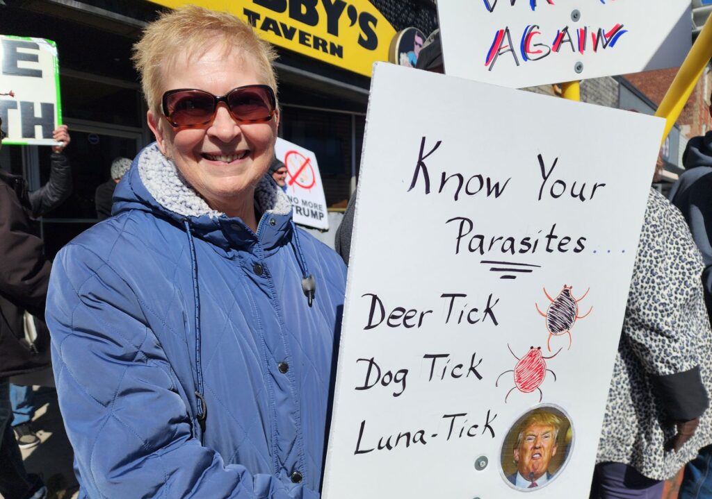 Standing on the sunny side of North Main Street, Judy Powell of Bowling Green held a sign advising citizens to “know your parasites,” with images of a deer tick, dog tick, and “luna-tick” with a photo of Trump.