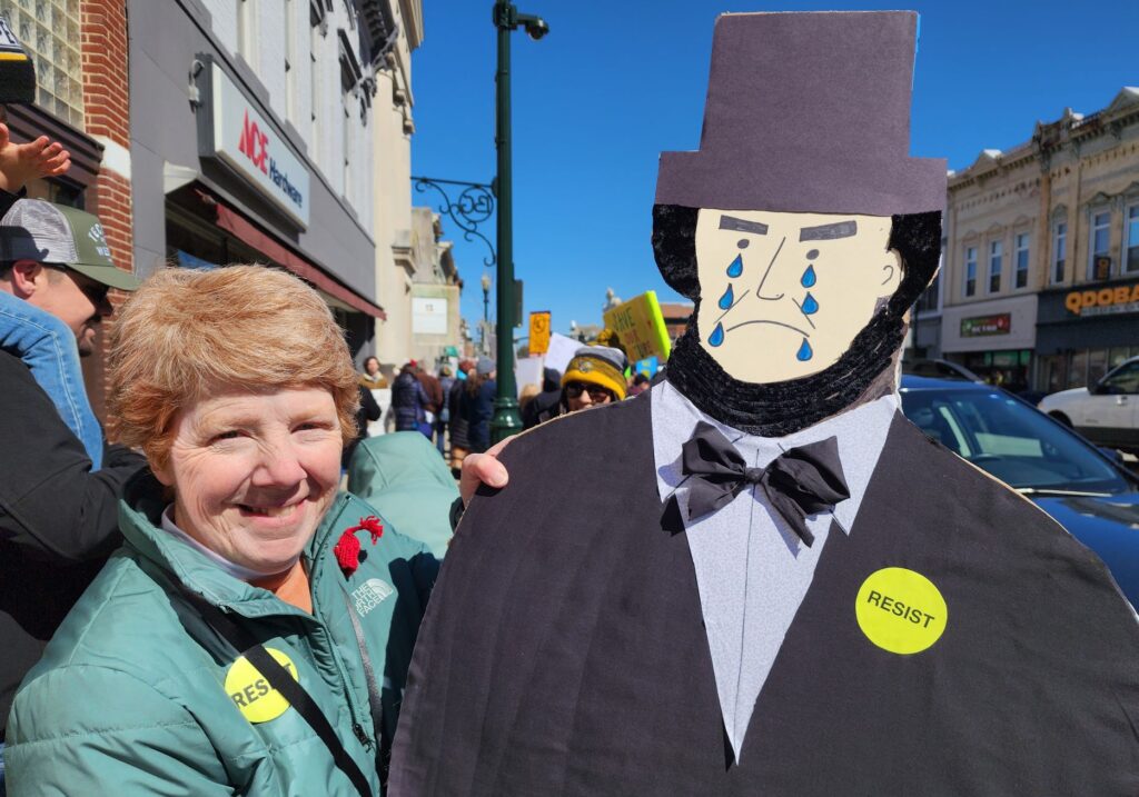 Retired teacher, Carol Slater of Bowling Green, carried a cardboard cutout with a crying George Washington on one side and Abe Lincoln on the other.