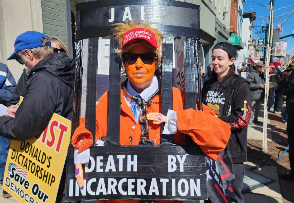 Michelle Gessner, of Findlay, created a walking display for the protest. With her face painted bright orange, a hat stating “Make America Smart Again,” and tiny plastic hands, she strolled the downtown behind prison bars with a chain around her neck.