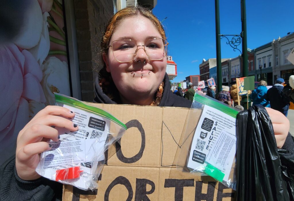 River Yatko, a student at Bowling Green State University, was roaming through the crowd offering protesters “whistle kits” to alert people if ICE agents are spotting in areas of the city. Yatko said she has particular concerns for international students at BGSU, who are now fearful of their status in the U.S.