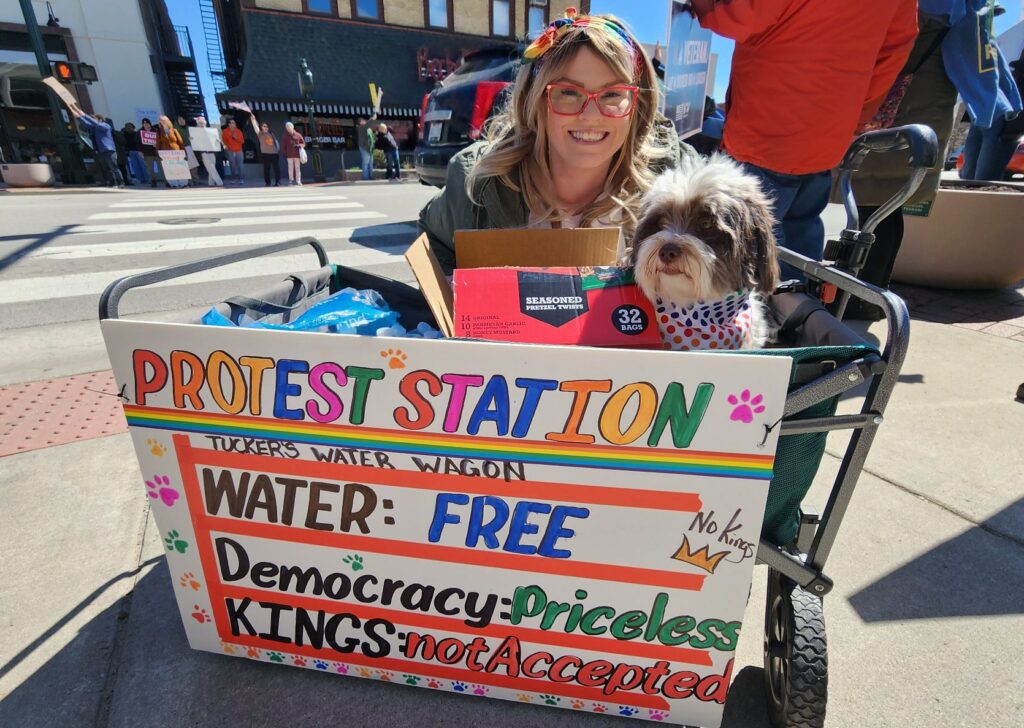 Also roaming the sidewalks was Tiffany Vandersall, of Waterville, who pulled a wagon carrying her dog Tucker, plus free water bottles and snacks of granola bars and pretzels for protesters.