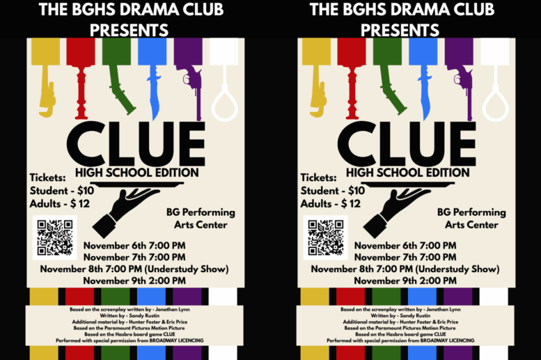 The Bowling Green High School Drama Club will present “CLUE: High School Edition” at the BG Performing Arts Center. Show times are listed below. This performance was written by Sandy Rustin and is based on the screenplay written by Jonathan Lynn.