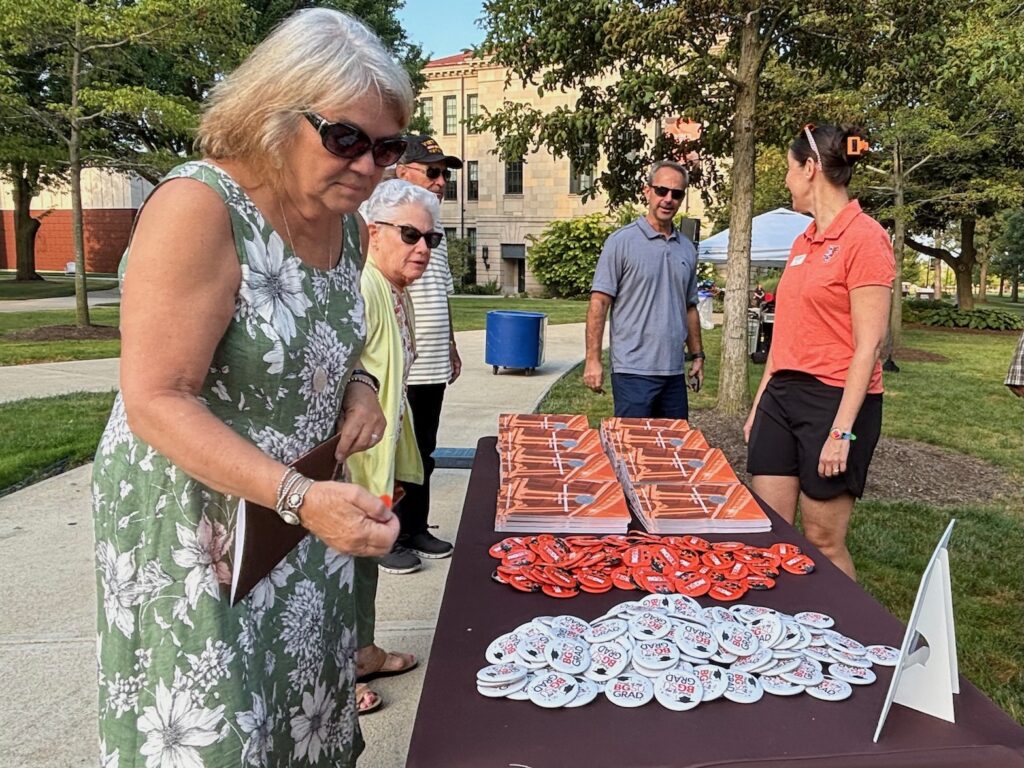 Friends and family members pick up a program and button to show Falcon pride in their graduates.