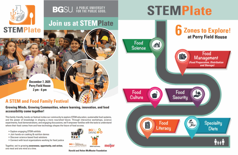 Bowling Green State University Dining, in collaboration with campus and community partners, invites students, families, and members of the learning and greater community to an educational afternoon at “STEMplate: A STEM and Food Family Festival” on Sunday, Dec. 7, from 2 – 6 p.m., at the Perry Field House.