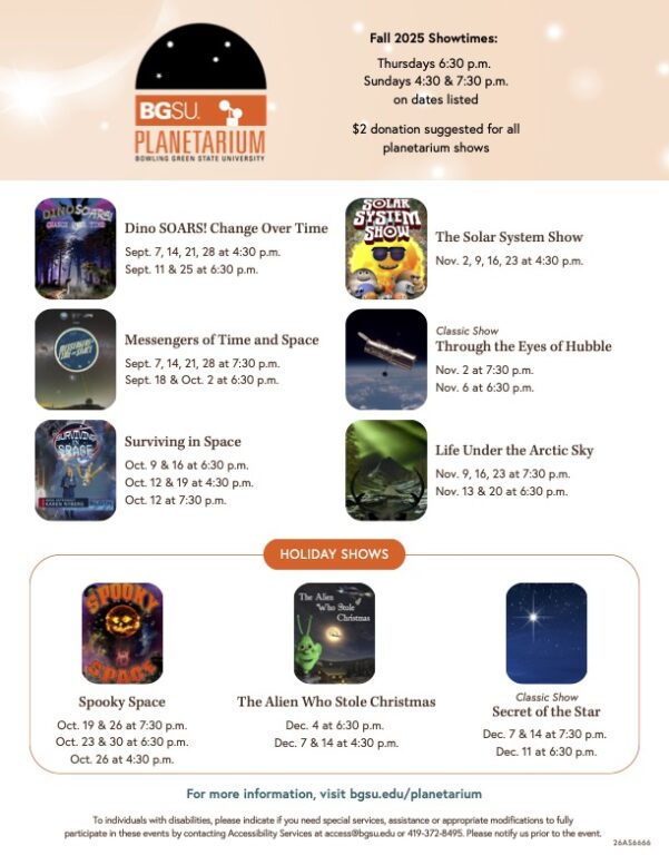 The BGSU Planetarium will offer a series of programs across a wide range of topics for Fall 2025 shows, including three shows new to the public schedule.