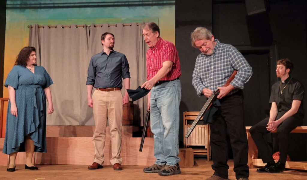 Louann (Rin Moran) and James (Kyle Walsh) watch as Earl (Gary Insch) and Walt (Mark Owen) prepare for a hunting trip as Reverend Bobby Groves (Justin Michael Newcomb) looks on.