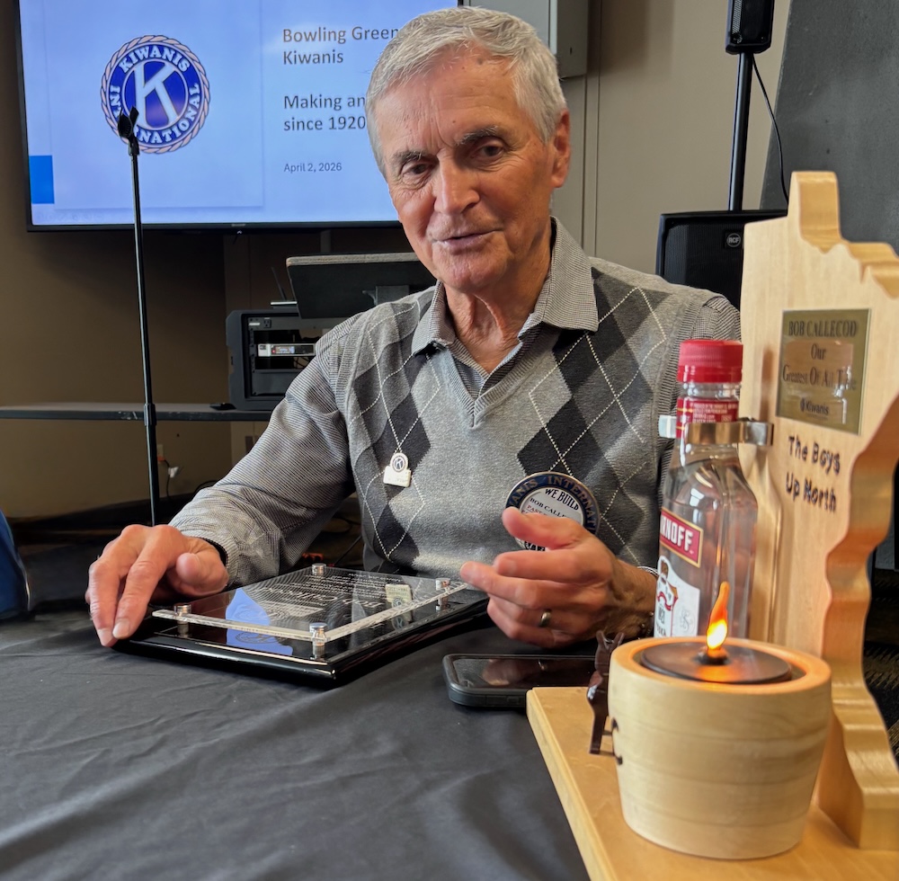 The Bowling Green Kiwanis Club presented Bob Callecod with a uniquely designed trophy by Mike Shertzer, recognizing his impact on the club’s membership and leadership.