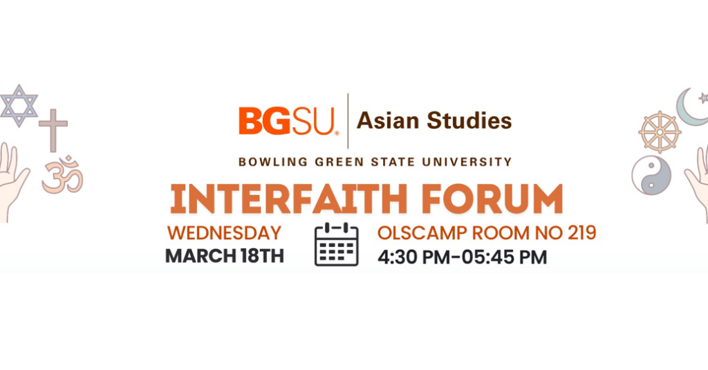 The community is invited to Bowling Green State University to attend its interfaith forum on Wednesday, March 18, from 4:30 – 5:45 p.m., in 219 Olscamp Hall. Dr. Andrew Kunze, assistant teaching professor in history, Asian studies, and international studies at BGSU, will moderate the discussion.