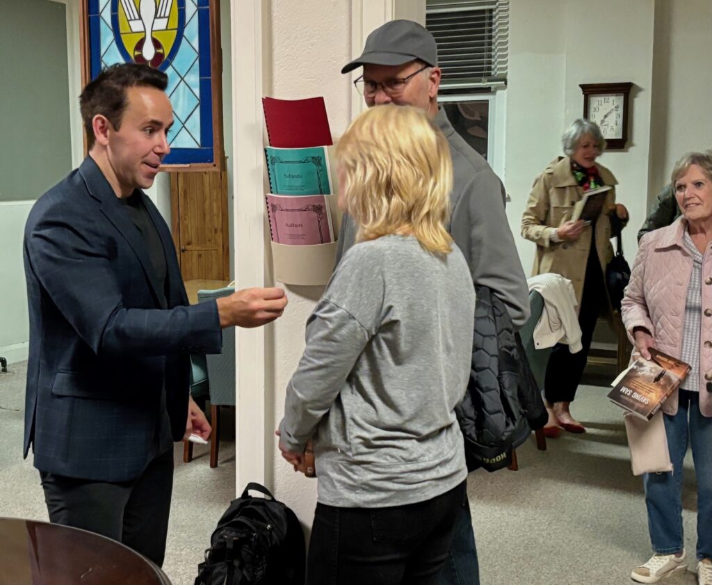 Sam Goodwin talks with a couple during the meet and greet portion of the library’s author event.