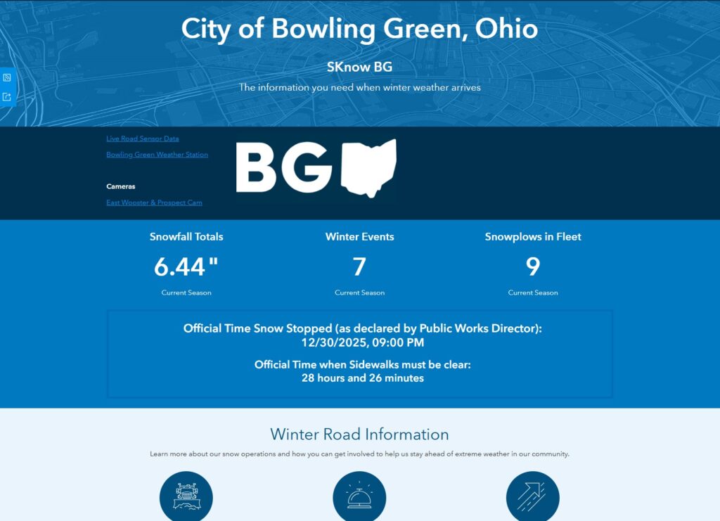 Bowling Green residents and commuters alike now have a way to know the latest on road conditions during winter weather. The “SKnow BG” dashboard provides real-time information on snow and ice removal in the City of Bowling Green. Designed in-house by the GIS and Public Works Departments, Sknow BG can be accessed on any mobile device or desktop, allowing viewers to receive timely snow emergency alerts, request services from the city, and search the status of snow removal based on address.