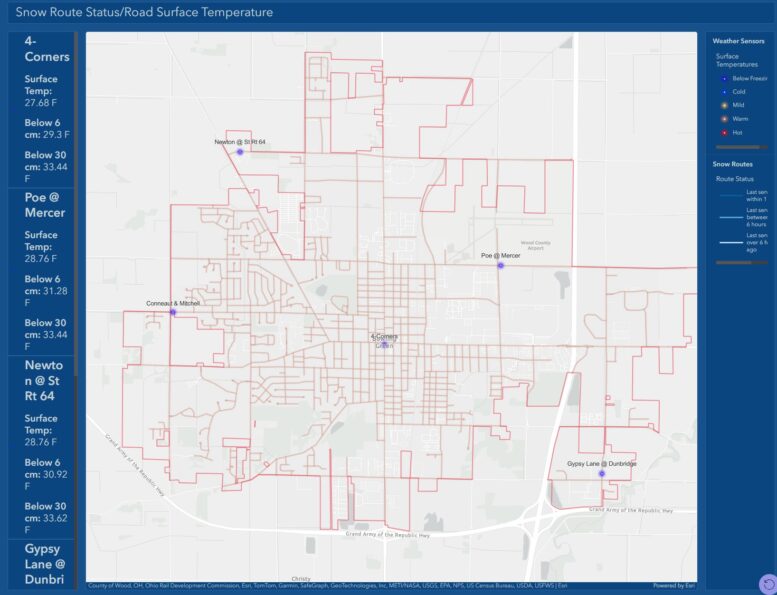 • Live road sensor data that showcases surface temperatures of five main intersections, and a color-coded map of surface temperatures and snow route history based on 1 – 6 hours of servicing.