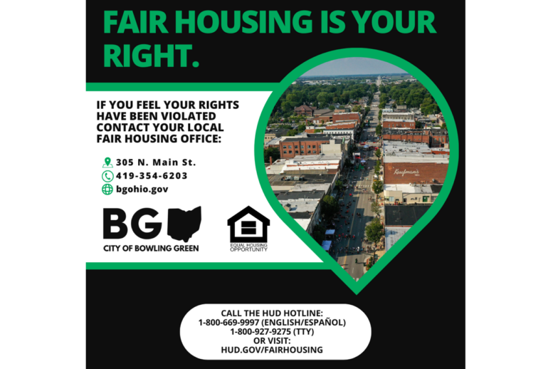 The city encourages community members to acquaint themselves with their rights protected by law and to join in reaffirming a commitment to fair housing for all. Throughout the year, the public can find information shared by the city of Bowling Green that helps citizens know their rights under the Fair Housing Act and how to seek assistance with fair housing matters. Those interested in this information can find flyers in the City Administrative Services Building, advertisements in local media, and posts from the city’s social media accounts.