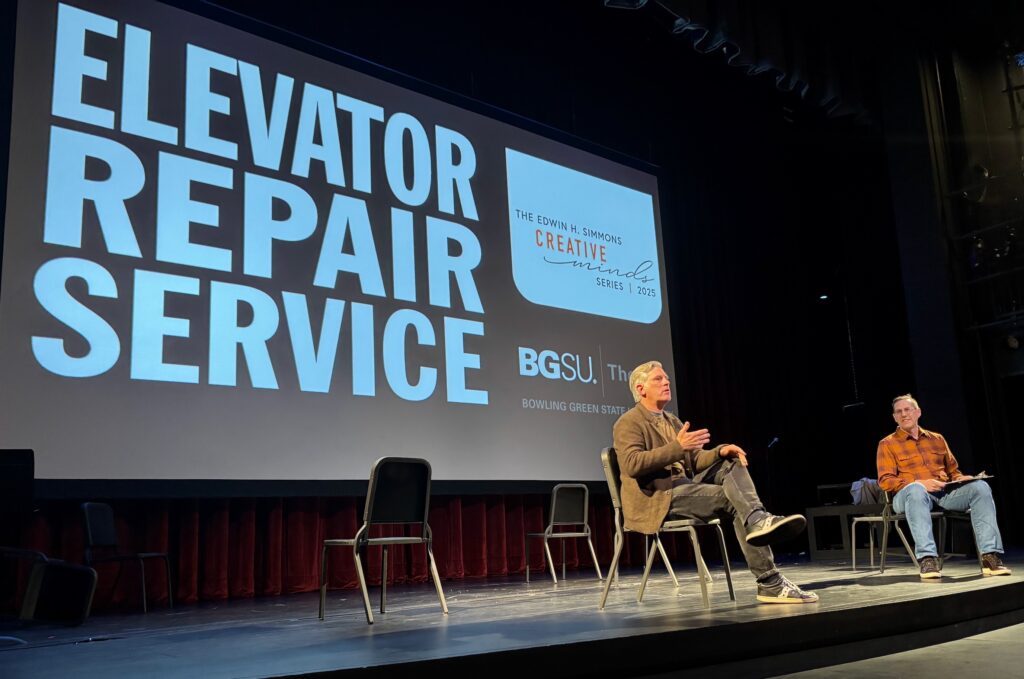 John Collins, (left) founder and artistic director of Elevator Repair Service, and Jonathan Chambers, chair of the BGSU Department of Theatre and Film, during a talkback after the Creative Minds performance.