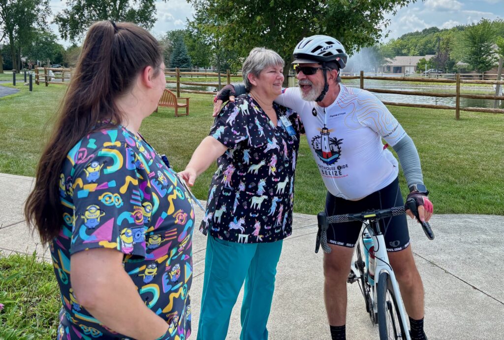For Sue Coffman Donaldson, the visit by the cyclists was a little bittersweet. The day of their visit was the 48th anniversary of her marriage to avid cyclist husband, Gary. He would have loved to talk with the four men about their shared love of bicycling, but last Aug. 27, he was killed while riding his bicycle not far from their villa at Otterbein Pemberville’s Senior Life community.