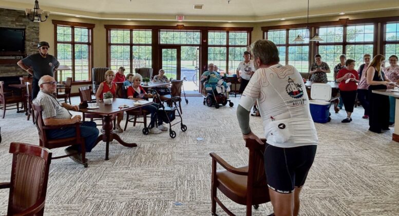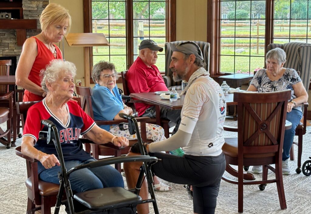 Cyclist Tom Makarwicz talks with some of the Otterbein Pemberville residents.
