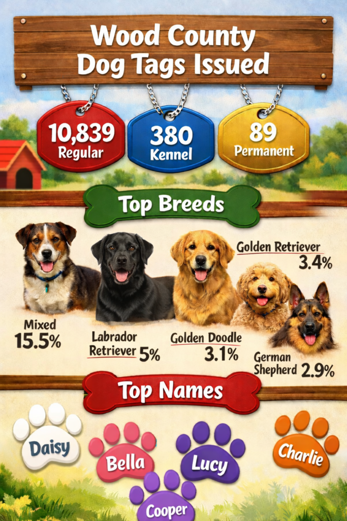Wood County Auditor Matthew Oestreich has announced information on the 2026 dog licensing renewal period. A total of 10,839 regular licenses, including 1-year or 3-year licenses, 89 permanent licenses, and 380 kennel licenses were issued. Ohio law requires that dogs three-month-of-age and older are registered and licensed annually, unless a three-year or permanent license has been purchased.