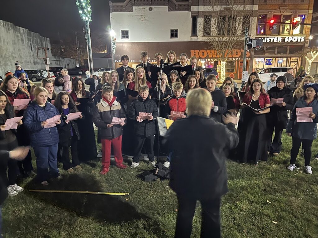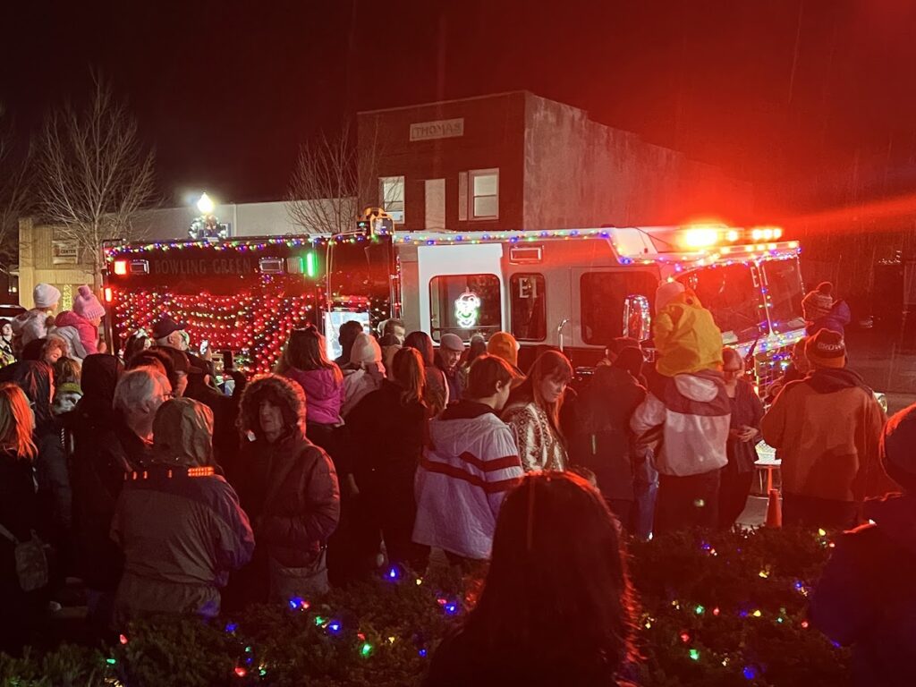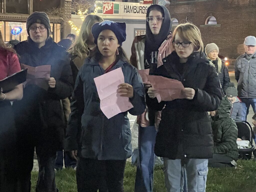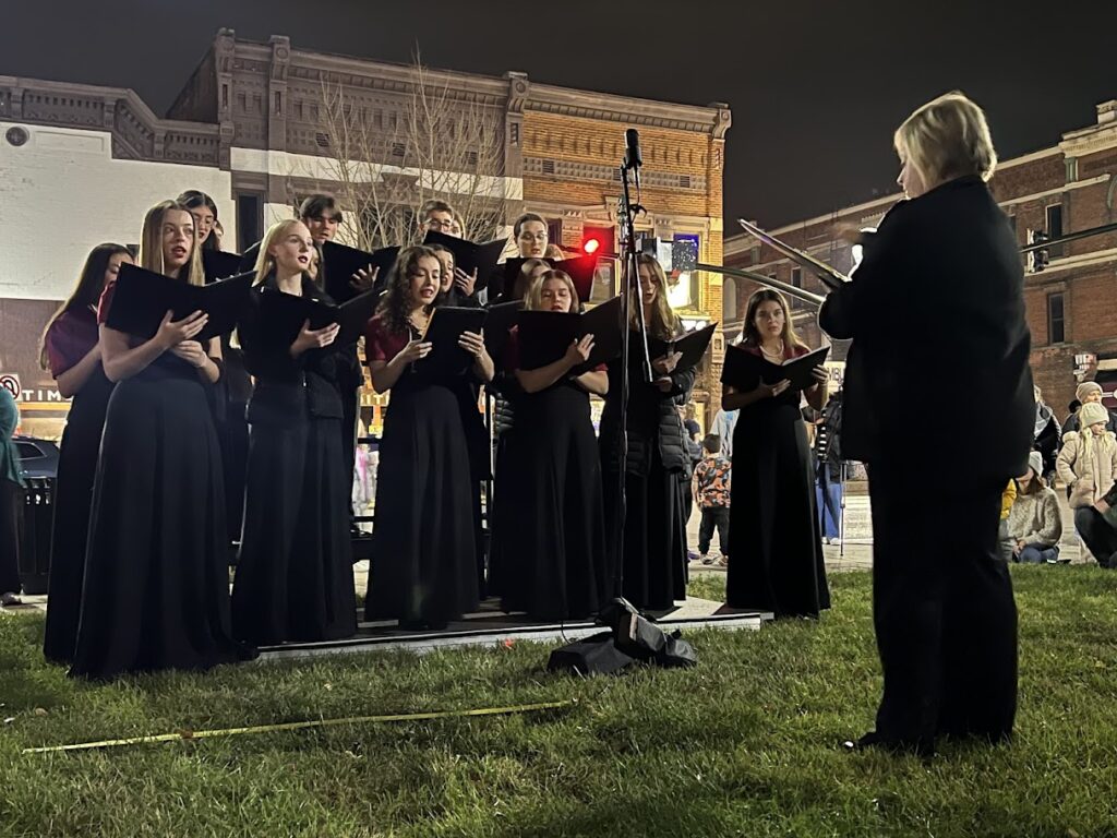 On Friday, Nov. 21, the community gathered, despite drizzle, to watch the community tree lighting. Festivities began at the Wood County District Public Library with a holiday storytime in The Children’s Place. Maria Simon, the library’s youth services coordinator, and volunteers read “The Perfect Tree” aloud to the children. People then migrated outside to listen to the Madrigals perform holiday songs, including “Silent Night” in German, English, and American Sign Language.