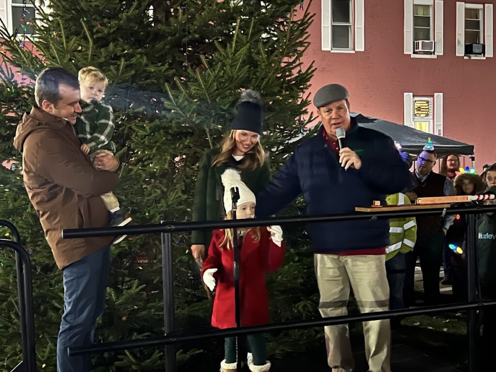 Mayor Mike Aspacher and the Crawfords get ready to light the tree
