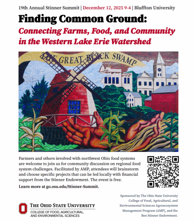 This year’s 2025 Stinner Summit will be at Bluffton University on Dec. 12. Attendees can explore ways of “Finding Common Ground: Connecting Farms, Food, and Community in the Western Lake Erie Watershed.” The event will be an opportunity to network with others connected to food and farming and to discuss areas of misunderstanding as well as shared needs. AMP is especially interested in having farmers participate in this discussion, but the event is also open to policy-makers, educators, food processors, consumers, or anyone else interested in creating projects that help better connect farmers, food, land, and people.