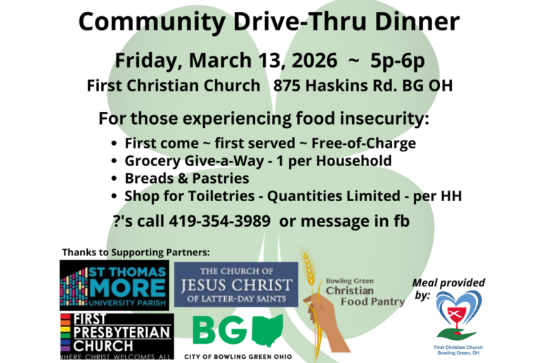 On Friday, March 13, from 5 – 6 p.m., First Christian Church of Bowling Green (FCC), 875 Haskins Road, will host its monthly drive-thru community meal and food distribution. Those who are experiencing food insecurity are encouraged to participate in this free meal. Participants are also encouraged to pick up a limited number of groceries, toiletries, breads, and pastries at no charge.