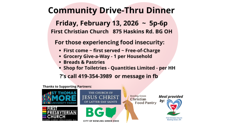 On Friday, Feb. 13, from 5 – 6 p.m., First Christian Church of Bowling Green (FCC) , 875 Haskins Road, will host its monthly drive-thru community meal and food distribution. Those who are experiencing food insecurity are encouraged to participate in this free meal. Participants are also encouraged to pick up a limited number of groceries, toiletries, breads, and pastries at no charge.