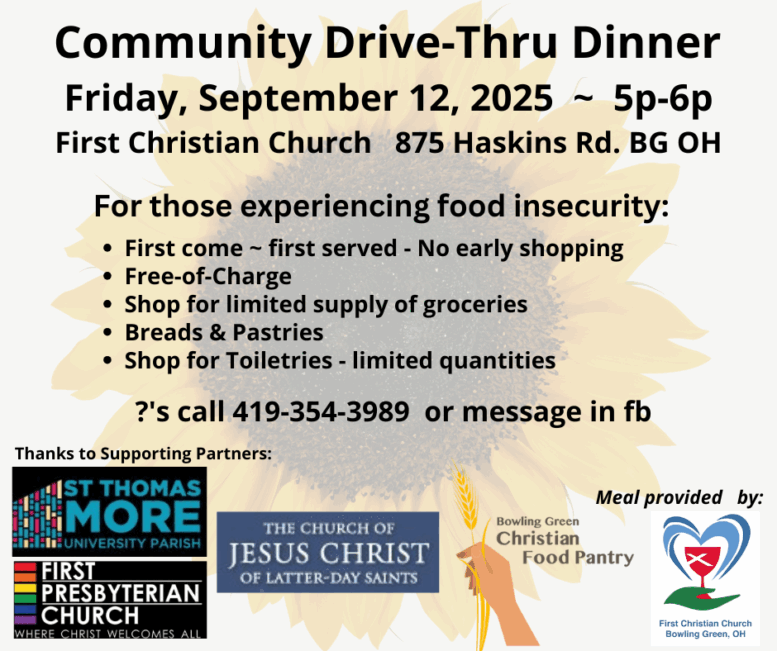 The First Christian Church of Bowling Green (FCC), 875 Haskins Road, will host its monthly drive-thru community meal and food distribution on Friday, Sept. 12, from 5 – 6 p.m. Those who are experiencing food insecurity are encouraged to participate in this free meal. Participants are also encouraged to pick up a limited number of groceries, toiletries, breads, and pastries, at no charge.