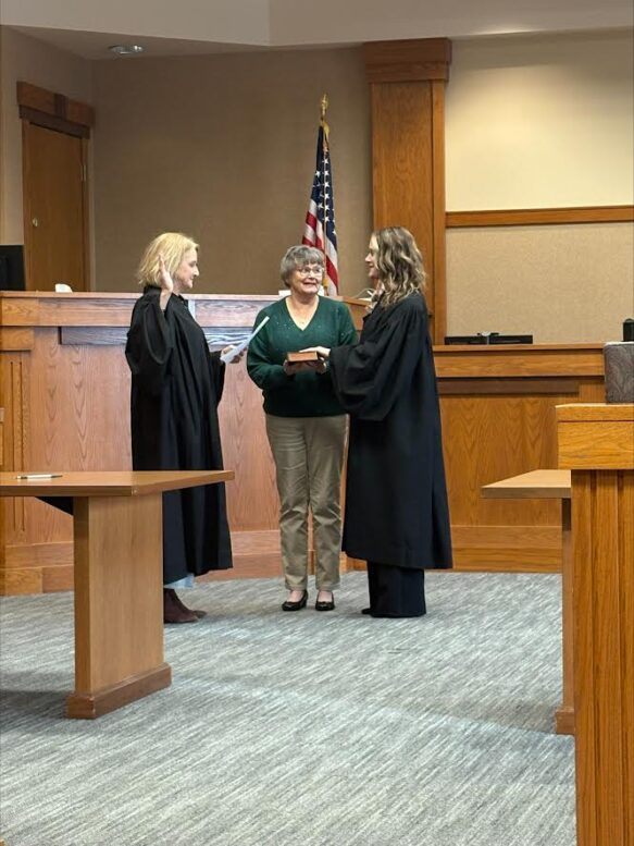 On Tuesday, Wood County’s first female Common Pleas Court Judge Mary “Molly” Mack swore in the first female Bowling Green Municipal Court Judge Alyssa Blackburn. Blackburn, who took over as judge when Mark Reddin retired last year, was elected by voters to the position in November. Standing in between the two judges is Blackburn’s mom, Diane Blackburn, who is holding the Bible of the judge’s father who passed away in 2022.