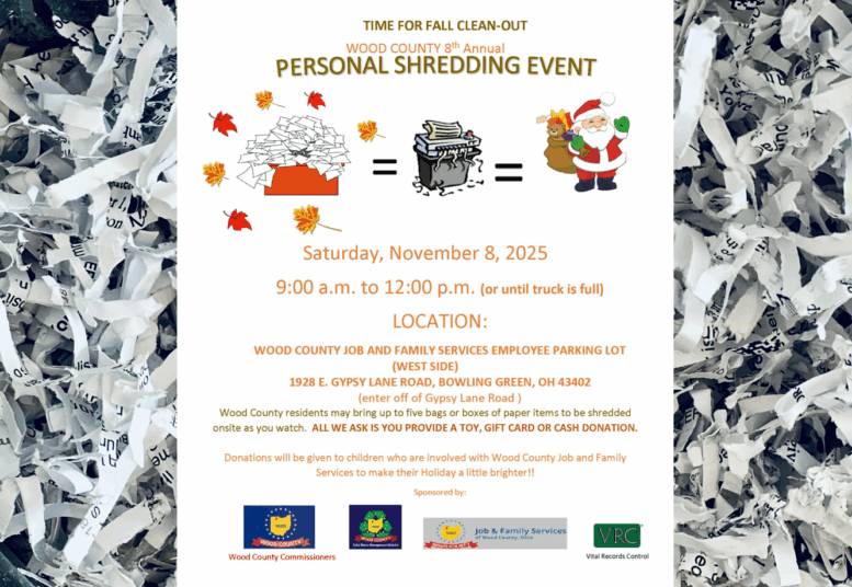 Wood County residents may bring up to five bags or boxes of paper items to be shredded on site and may observe the shredding. Residents are asked to provide a toy, gift card, or cash donation. The donations will be given to children who are involved with Wood County Job and Family Services to make their holiday a little brighter.