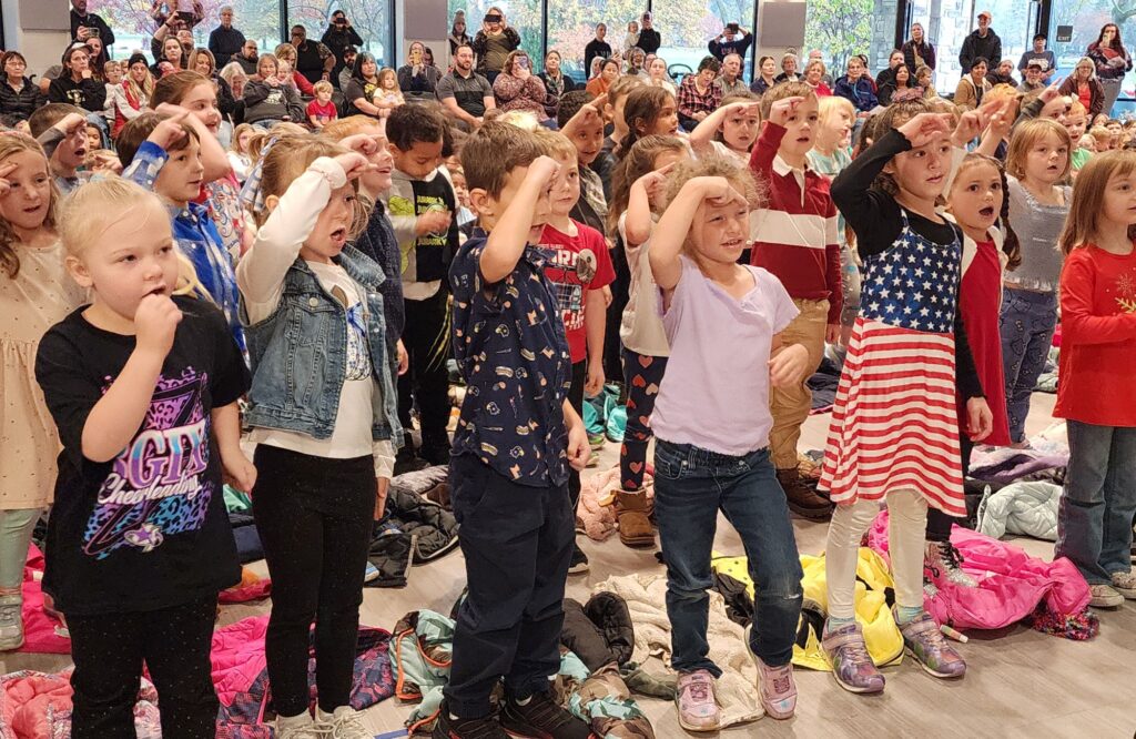 The kindergartners saluted as they sang about the “Grand Old Flag.” The fifth graders read aloud a poetic tribute to veterans featuring a line written by each of the students.