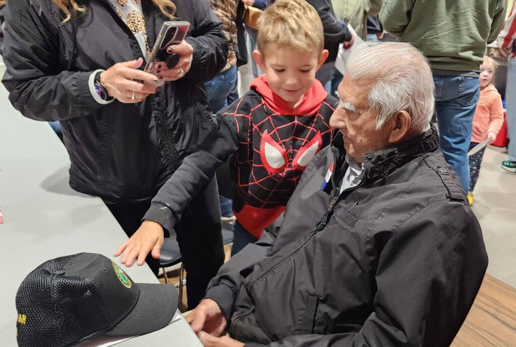 And as each veteran stood to introduce themselves, they gave a shoutout to the family member or neighbor who invited them. Students proud to be represented by the veterans shot to their feet and waved frantically so they could be seen from the stage.