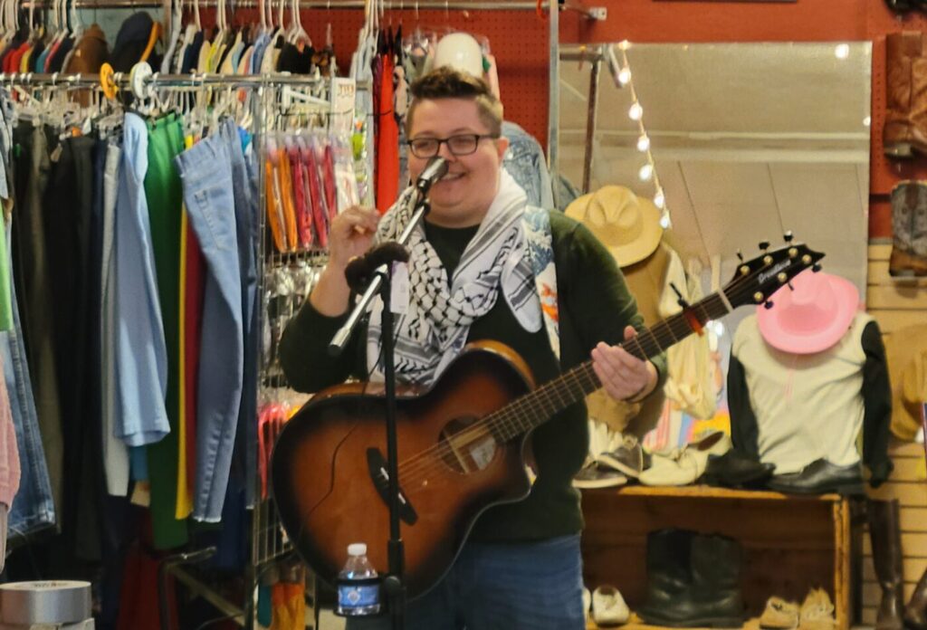 Elai Rose was the first musical act of the night. They are a singer/songwriter who makes regular appearances in nearby house shows and bars. “This is the first show I’ve played since Joy passed away, so that’s a big deal for me. I’m excited to see events like this happening.”