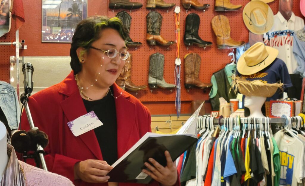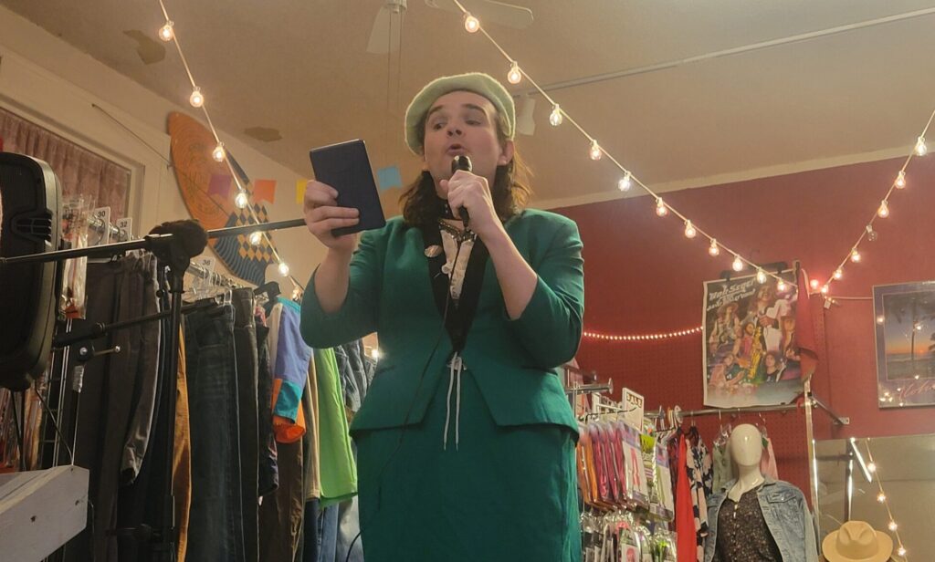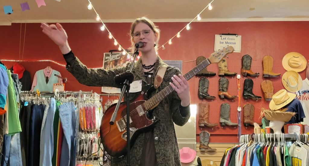 Fellow veteran of the DIY music scene, Selah Cadence Carter, performed after Rose. “I always wanted to be a rockstar, to be honest. I’ve had a few bands in the area, but I just started – within the last year – presenting my own work.” Though by herself on stage, her vocals, electric guitar and loop pedal lit up the whole store.