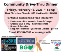 On the second Friday of each month, from 5 – 6 p.m., First Christian Church of Bowling Green (FCC), 875 Haskins Road, hosts its monthly drive-thru community meal and food distribution. This next meal is set to take place on Friday, Dec. 12.