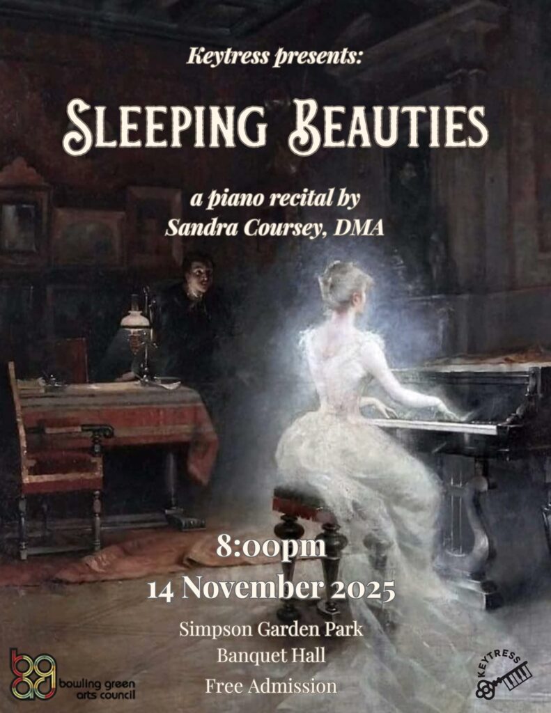 On Friday, Nov. 14, at 8 p.m., Dr. Sandra Coursey (Keytress) will present “Sleeping Beauties,” a solo piano recital highlighting rarely-performed romantic-era works by women composers. The concert will take place at Simpson Garden Park Banquet Hall, 1291 Conneaut Ave., Bowling Green, as part of the Bowling Green Arts Council’s “Stealing Your Heart” concert series. The event is free and open to the public. Doors will open at 7:30 p.m.