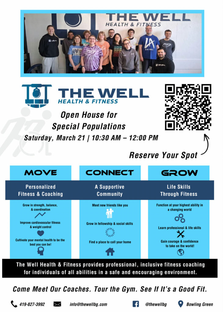 An adaptive open house, scheduled for March 21 from 10:30 a.m. to noon, will give potential athletes and families a chance to tour the space, try exercises and learn about available programs. The Well is located at 1099 N. Main Street, at the rear of Halleck Auto Sales.