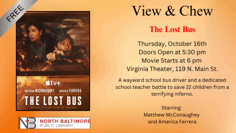 The North Baltimore Public Library will host its free “View & Chew” event on Thursday, Oct. 16. The movie will be “The Lost Bus,” starring Matthew McConaughey and America Ferrera. This movie is based on true events that occurred during the California Camp Fire, which devastated the town of Paradise, California, in 2018.