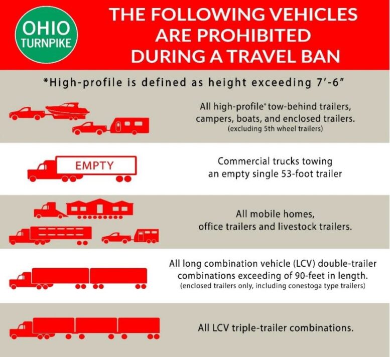 The following types of vehicles will be banned from traveling on the Ohio Turnpike until the travel restriction expires or is canceled: