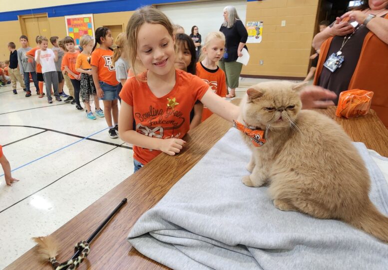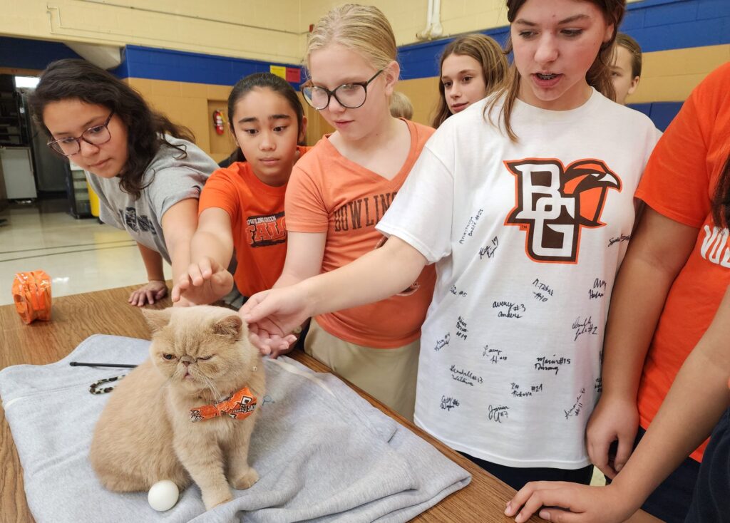The locker room cat for the Bowling Green State University football team and his owner took their show on the road Tuesday with a visit to St. Aloysius School in Bowling Green.