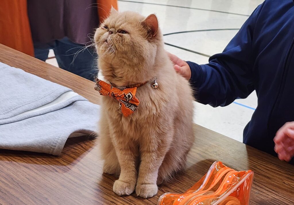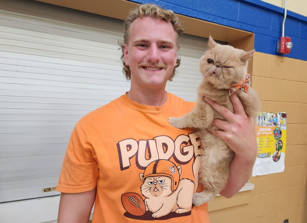 The football player and his feline were escorted to the gym, where each class came in to get a close up look at Pudge. Carlson brought a few toys to keep the cat’s attention, but they were really not necessary.