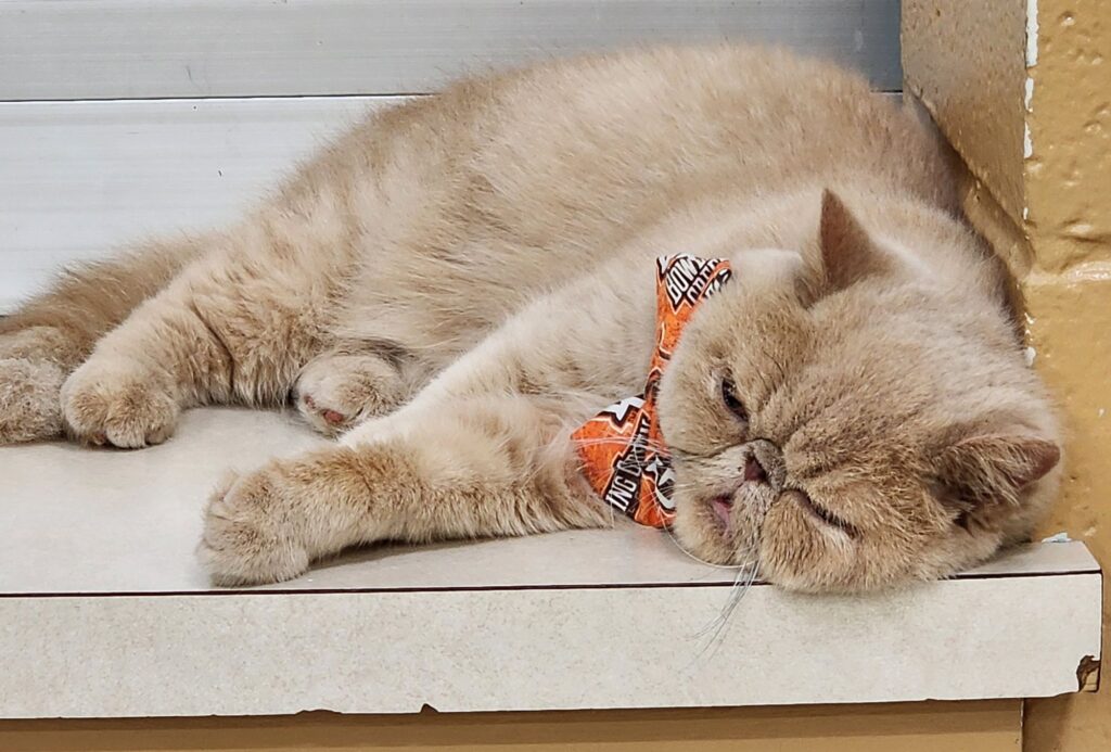 With his face smushed in and his tongue stuck out, the 3-year-old exotic shorthair is cute and ugly at the same time. Add in his bowtie, and Pudge looks oddly distinguished.