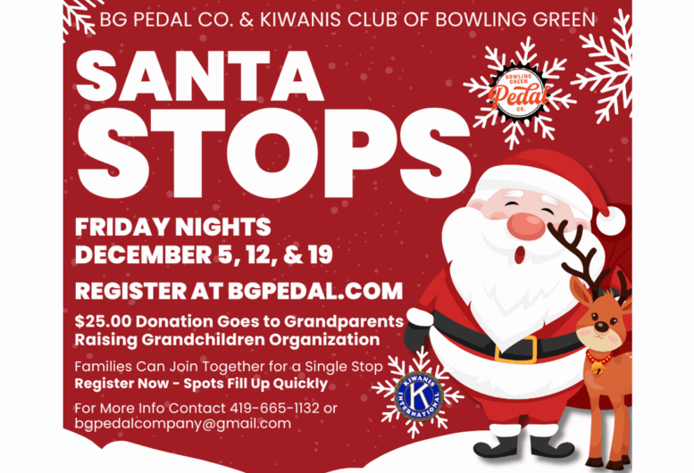 BG Pedal Bike Company and Kiwanis Club of Bowling Green have partnered together to offer the opportunity for Santa to visit people’s homes. On Friday nights, Dec. 5, Dec. 12, and Dec. 19, Santa will be making scheduled stops throughout the community.