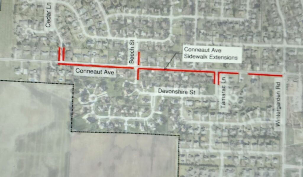 Funding for both sidewalks was part of the city’s successful ODOT Safety application, which will fund approximately 90% of the construction costs. For the Conneaut Avenue sidewalk, that means the city’s share will be about $49,630 of the total $496,300 project cost. For the South Wintergarden Road sidewalk, the city’s share will be about $34,927 of the total $349,271 cost.