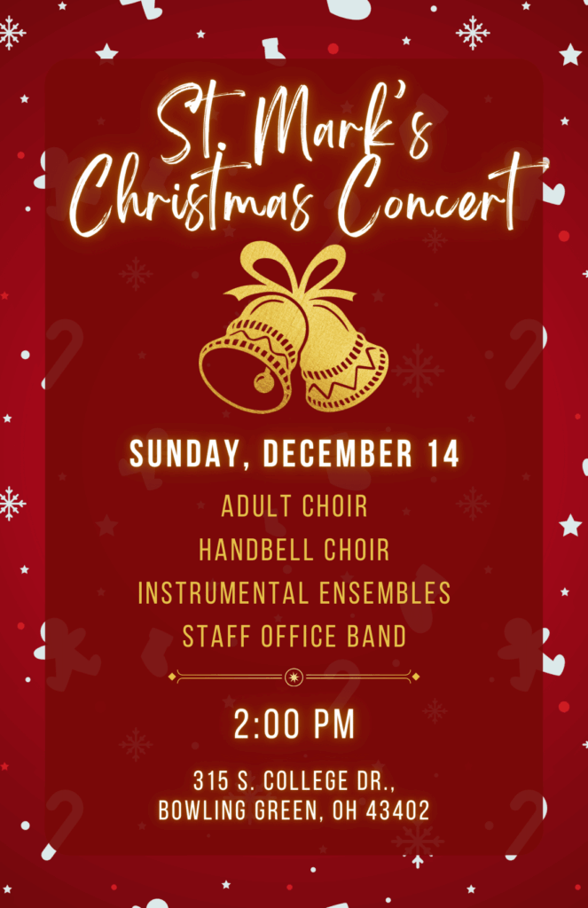 St. Mark’s Lutheran Church, 315 S. College Drive in Bowling Green, will host a Christmas concert on Sunday, Dec. 14, at 2 p.m. There will be performances from the adult choir, handbell choir, instrumental ensembles, and staff office band.