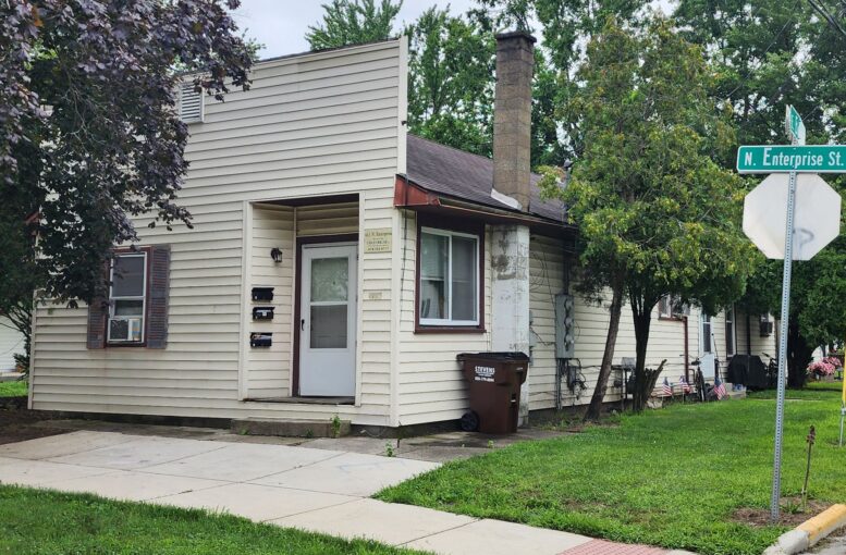 Since 1975 at the latest, the building at 443 North Enterprise has been divided into three apartment units. The only remnant of its history as a neighborhood store is the distinctive shopfront façade extending above the building’s roof.