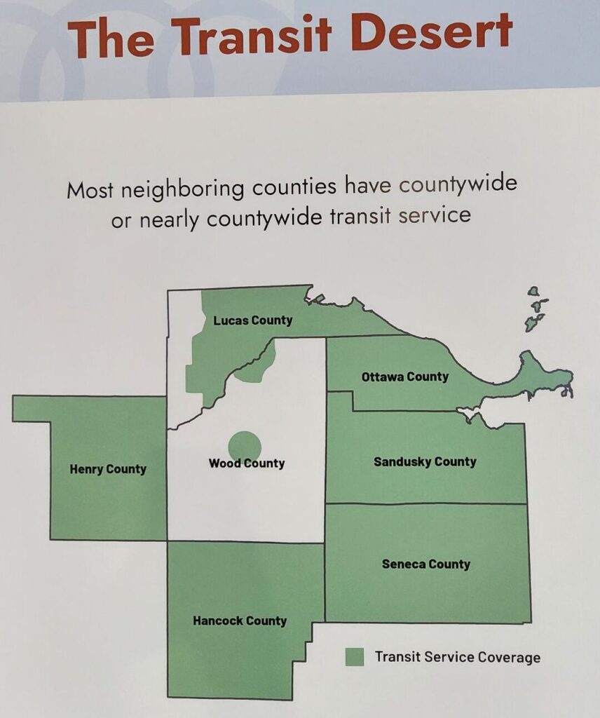A map shows countywide transportation systems in Henry, Hancock, Seneca, Sandusky, Ottawa and much of Lucas counties. But in Wood County, small shaded areas signify limited transit systems in Bowling Green and Perrysburg – leaving the wide open areas with no regular rides.