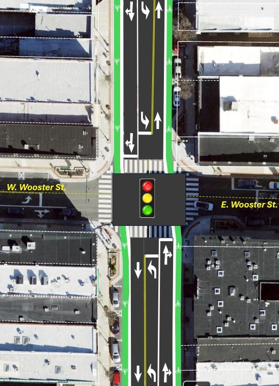 A roundabout at North Main Street and Poe Road? Less on-street parking? More one-way streets? Fewer lanes of travel. A bike bypass of the downtown? More pedestrian beacon crosswalks?