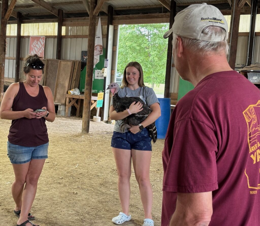 A tip offered by Maddie Westgate as she handled Linguine the turkey, was to the wear white. “I often wore a polo or tank top and then had a white lab coat to put on over it,” she said. “It’s usually hot and hard to stay clean in this barn. That way, you put the lab coat on just before showing.”