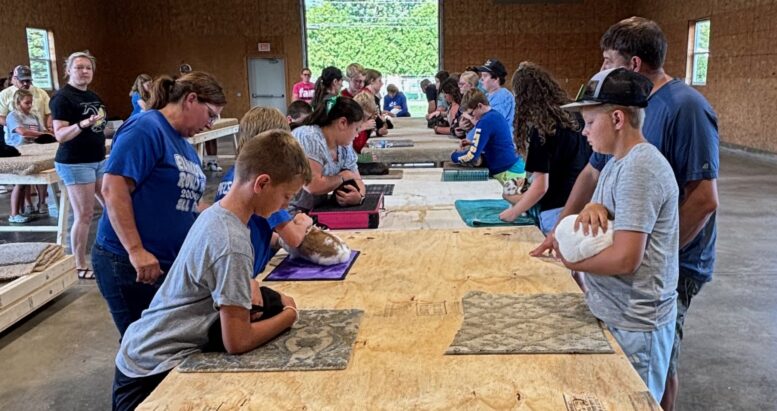Because how the animals are handled is a critical piece of showmanship judging, she demonstrated proper handling techniques for rabbits. Using their own rabbits, the young showmen practiced how to grip the rabbit’s scruff, position the rabbit and inspect various body parts.