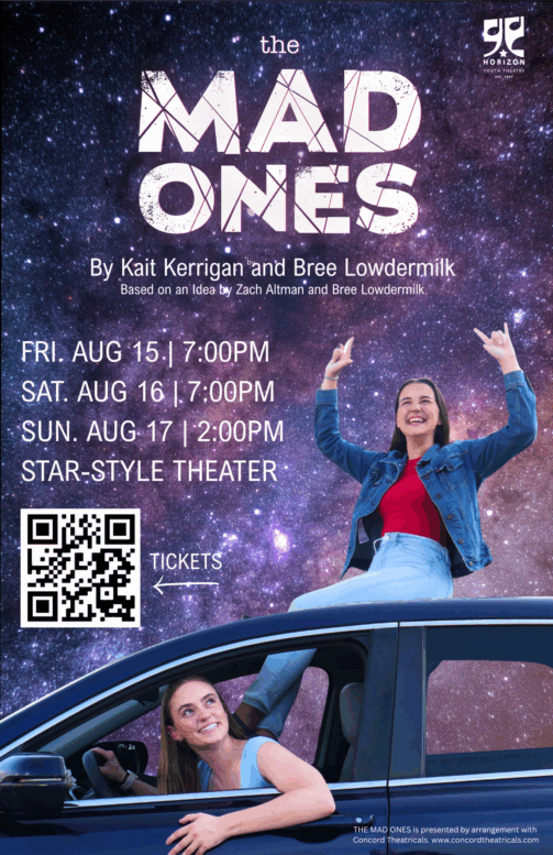 Horizon Youth Theatre is proud to present The Mad Ones, directed by Kelly Frailly, through special arrangement with Concord Theatricals. The chamber musical by Kate Kerrigan and Bree Lowdermilk will be performed at the Star Style Theater at The Woodland Mall, Bowling Green, Ohio on August 15 & 16 at 7:00 pm and August 17 at 2:00 pm. There will also be an understudy run to feature the hard work of those cast members at 7:00 pm on August 13. Tickets are $18 and $15 (group pricing available) and can be purchased on our website or at the door. Seating is general admission.